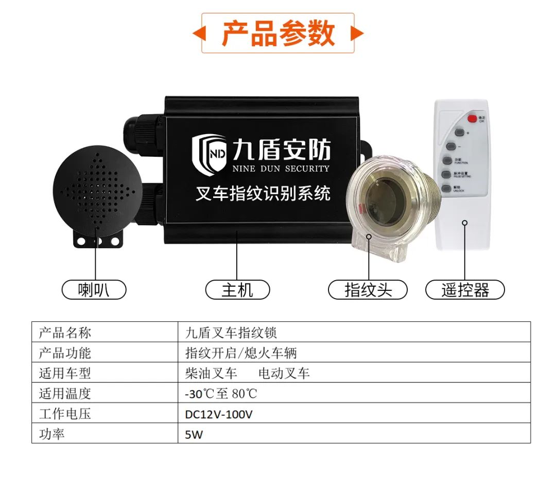 叉车指纹权限采集器又叫叉车指纹锁,九盾安防指纹锁可以帮助您解决无证人员随意驾驶叉车的危险行为,具有指纹录入一键启动叉车的功能;安装在钥匙孔代替钥匙,安装简单;油车电车都可以装,适用各种车型;支持宽电压设计12-80V;拒绝无证驾驶,从而从根本上杜绝隐患。