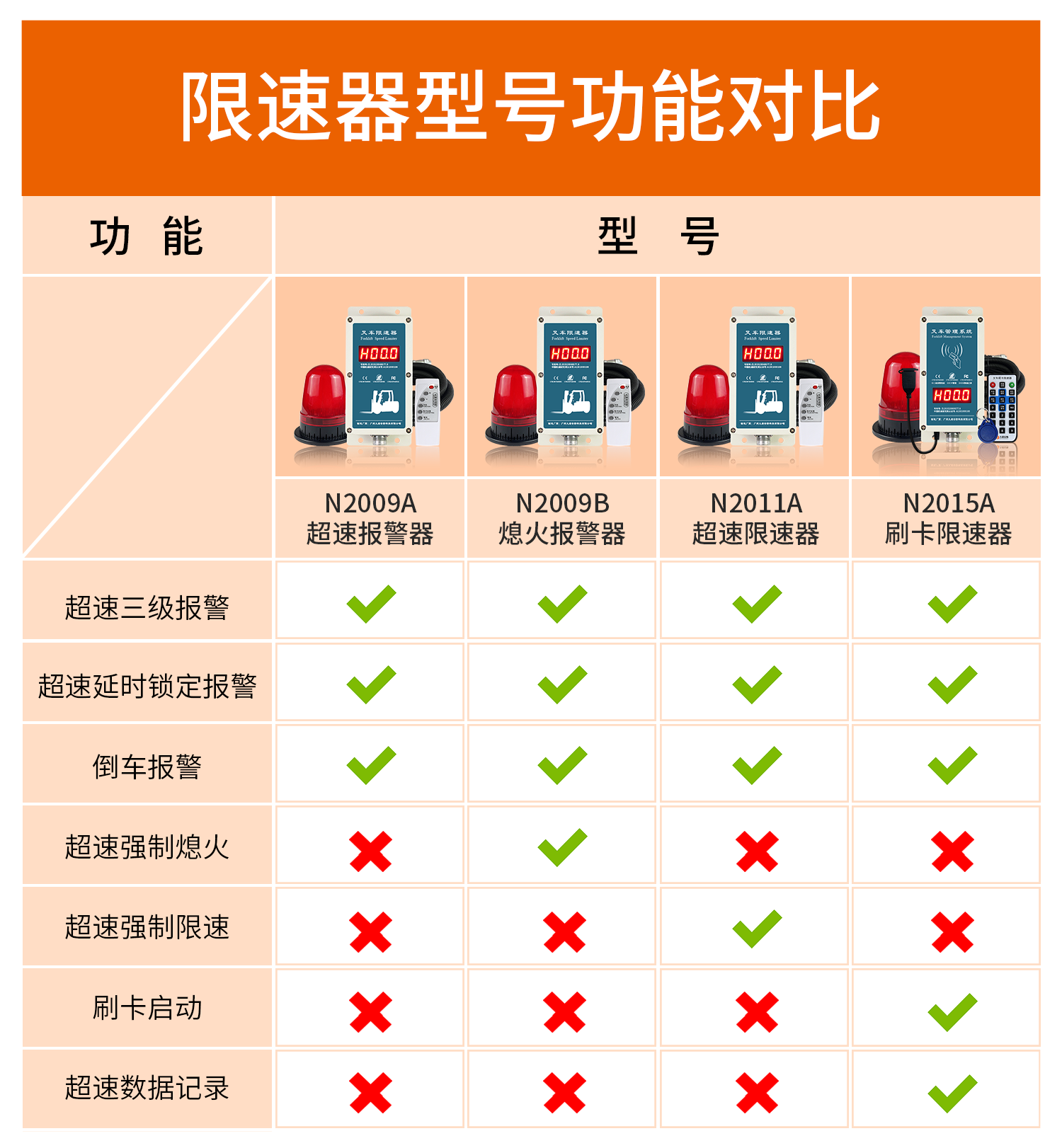 安装我司的叉车限速器能有效减少叉车因速度行驶过快而造成的安全事故,降低安全上的隐患,能够有效提高叉车司机的工作效率和对安全生产的警觉意识,叉车超速限速功能型号可以强制车辆降速或者设置为熄火,下面是我司目前生产的限速器型号,可以根据自己不同功能需求来进行选型: