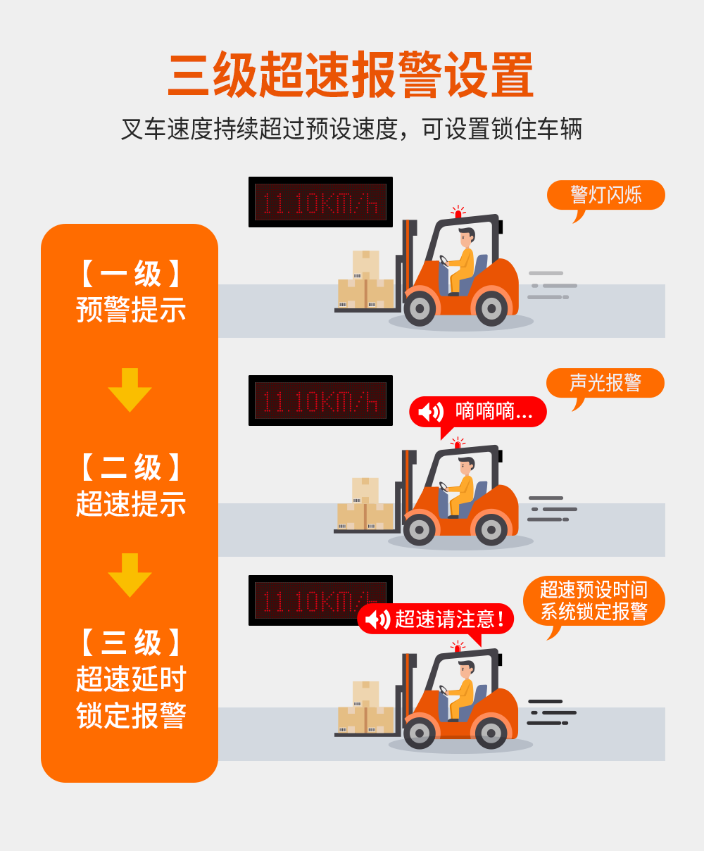 A、运输过程中,叉车超速行驶有什么危害呢?1、厂区的员工没有安全感,很难留住人才据叉车限速器厂家——九盾安防调查发现,大部分出入库的货物都是大件的重物,所以叉车是必不可少的,几乎是一直作业。而那些老司机也因工作量大很容易烦躁,经常为了“快点搬完,早点收工”而超速行驶。很多厂区员工感觉每天都像是生死时速的男主角,动作慢点就会被叉到,整天处在心惊胆战的日子中,很多不是辞职就是在准备转行中。2、安全事故屡见不鲜,超速工作就像在赶投胎。B、叉车限速器安装对厂区有什么好处?1、保障企业员工的生命安全,规避叉车超速事故。2、符合国家对厂区机动车辆年检的要求。3、减少企业因事故产生的财务负担。4、延长叉车的使用寿命。5、限速控油耗,运输成本下降。C、选择的叉车限速器需具备什么功能?强制限速:强制限速,控制车辆蕞高行驶速度。超速报警:当叉车行驶速度达到预设定的报警速度时,设备会发出持续的报警音,报警分为直行超速锁定报警,倒车超速锁定报警。