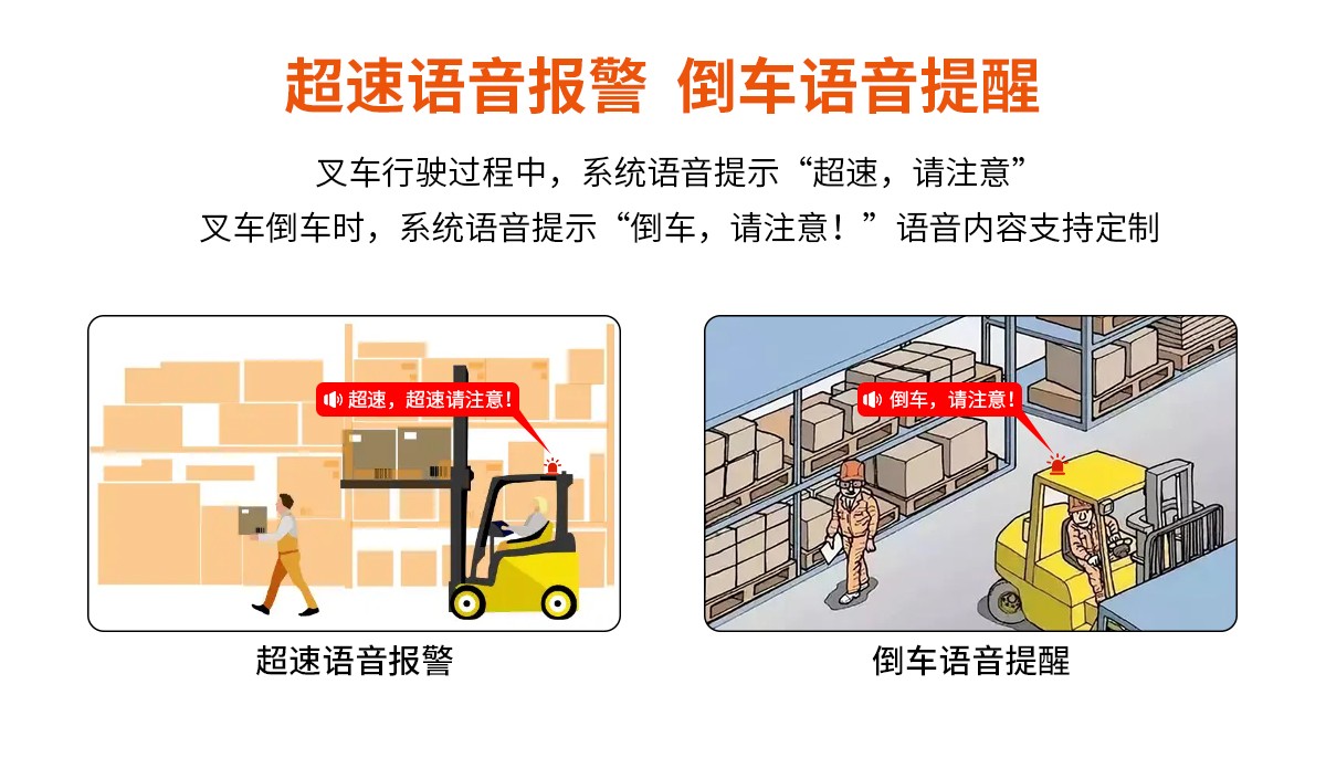 叉车的速度监控分为三个阶段。第一阶段为一级预警,警灯开始闪烁。提醒驾驶员速度过快了,需要减速;第二阶段是超速警报,警灯持续闪烁;同时开启语音报警:超速请注意;第三阶段为超速锁定,在前两个阶段的预警层面上,对叉车机器进行强制限速。从根本上保护好三方的安全。叉车倒车是使用叉车常用的一个操作,视线受阻是驾驶员在倒车中面临的最大问题,特别是复杂的拐角处、集中货物堆放,很容易会引起生产事故。安装九芯叉车限速器后,叉车在倒车时会有系统语音提示:“倒车,请注意。”能够很好地警示相关工作人员,避免无必要的受伤或事故。