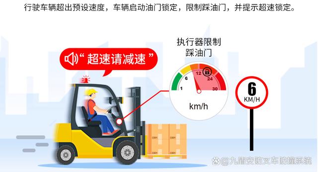 3、在叉车进出仓库口及限制区域时,自动声光报警,提醒其他员工注意叉车的到来,限速功能型号可以强制车辆降速或者设置为超速熄火。