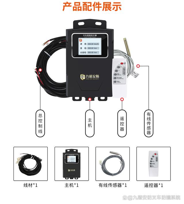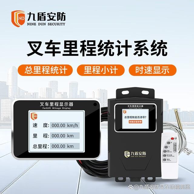 九盾里程表系统主要监控叉车等工业车辆的时速和里程,速度显示叉车实时车速,总里程统计叉车行驶总里程,设置里程统计当天里程,对叉车使用效率的提升起到数据化分析作用。
