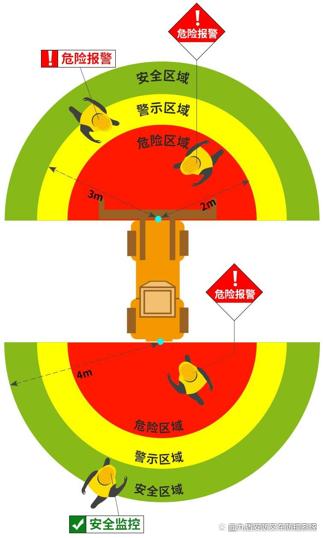 其中两颗具备补光设计的超广角摄像头,分别安装在车辆护顶架前后方(可定制前后左右),同时解决二个方向维度的视野盲区,可根据距离车辆的不同距离,增加行人监测主动画面和声音预警。当行人进入危险区域,可(选配)叉车熄火停车控制器,控制叉车熄火停车。