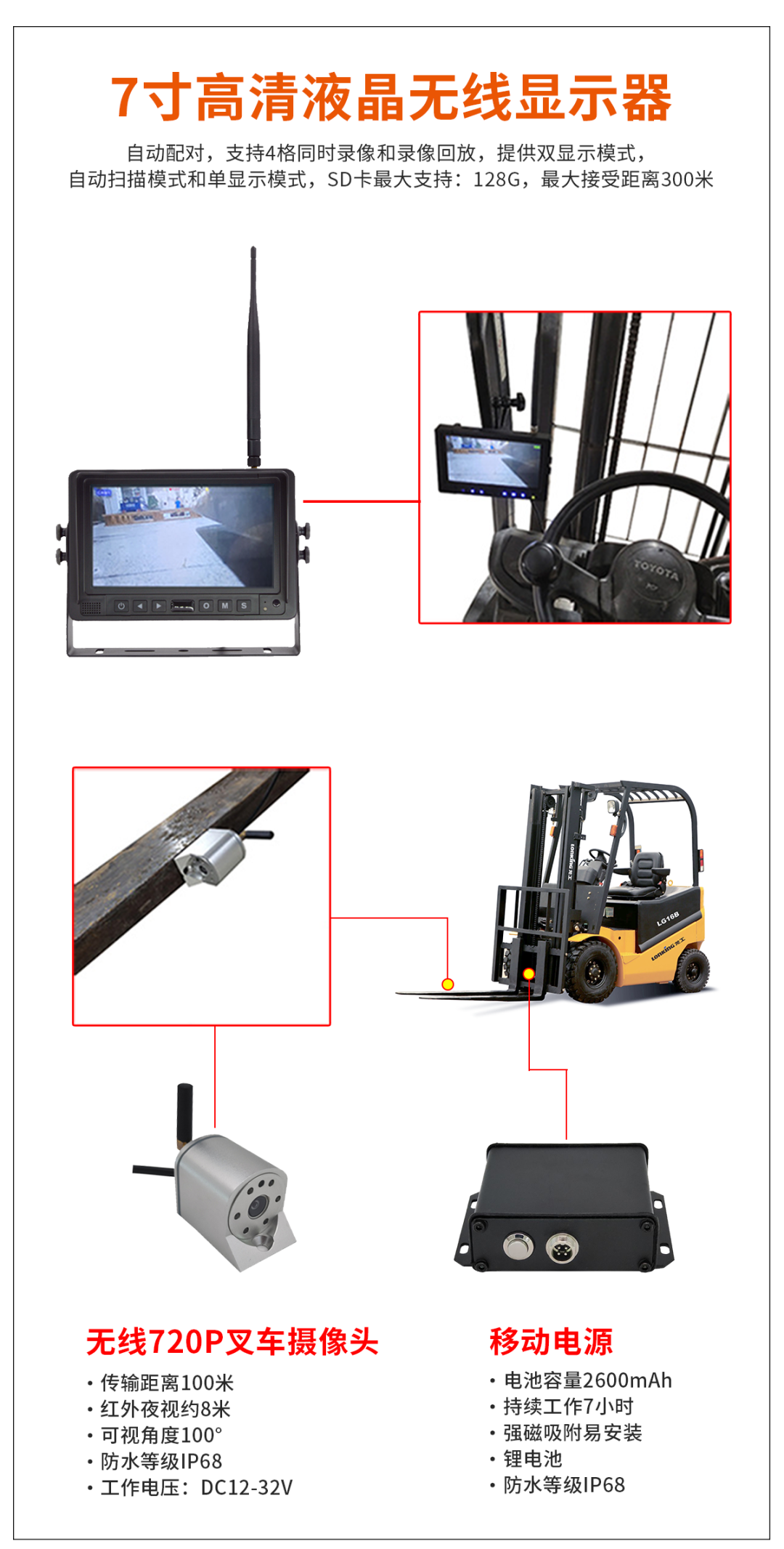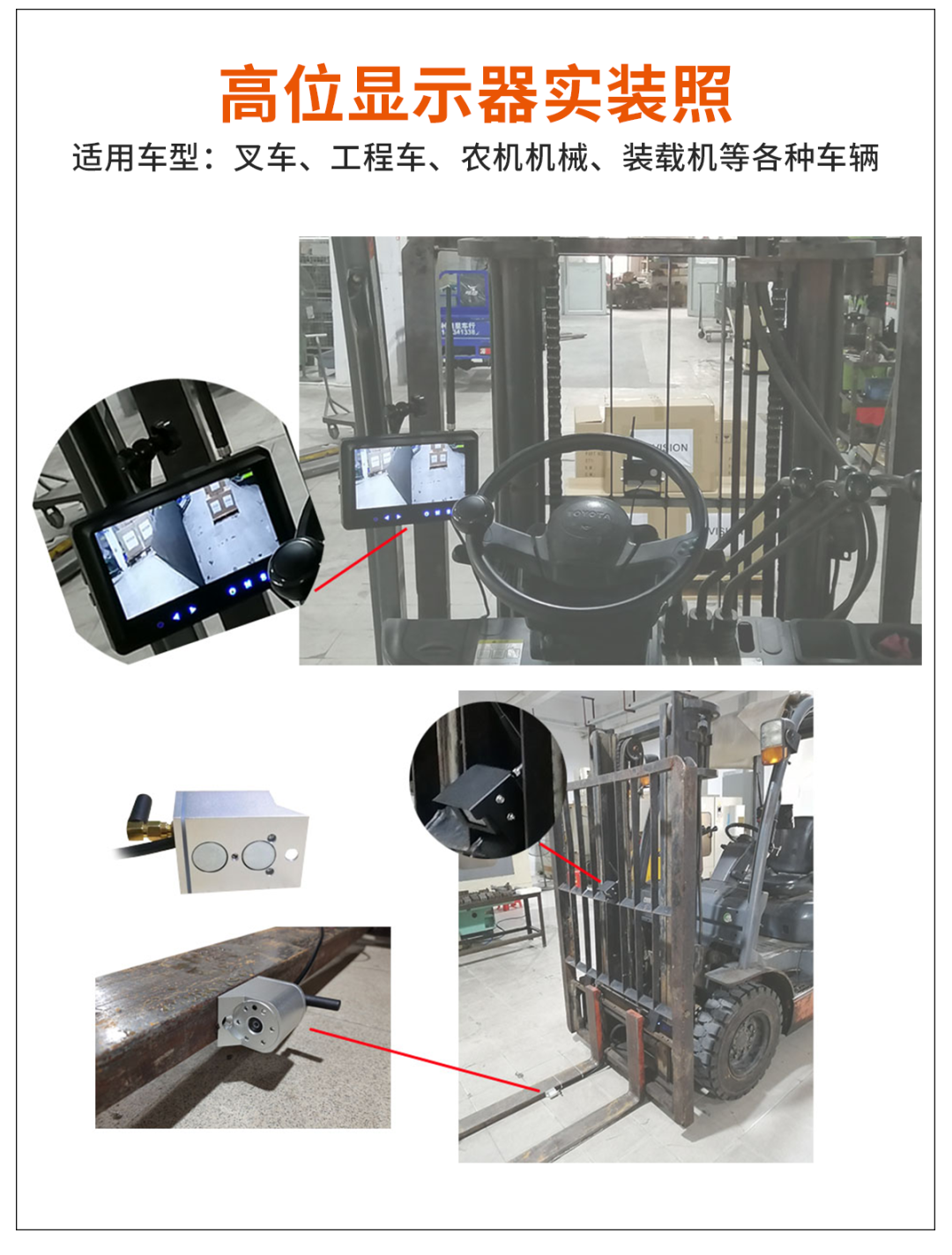 这款显示器配备 7 寸高清屏幕与无线摄像头,就像给叉车装上了 “千里眼”。作业时,驾驶员平视显示器,货叉一举一动清晰可见,从此告别视线受限的困扰。摄像头新增的激光定位线功能,堪称 “精准导航”。当叉车作业,红色直线精准投射,引导货叉准确插入托盘,大大减少操作误差导致的货物损耗。