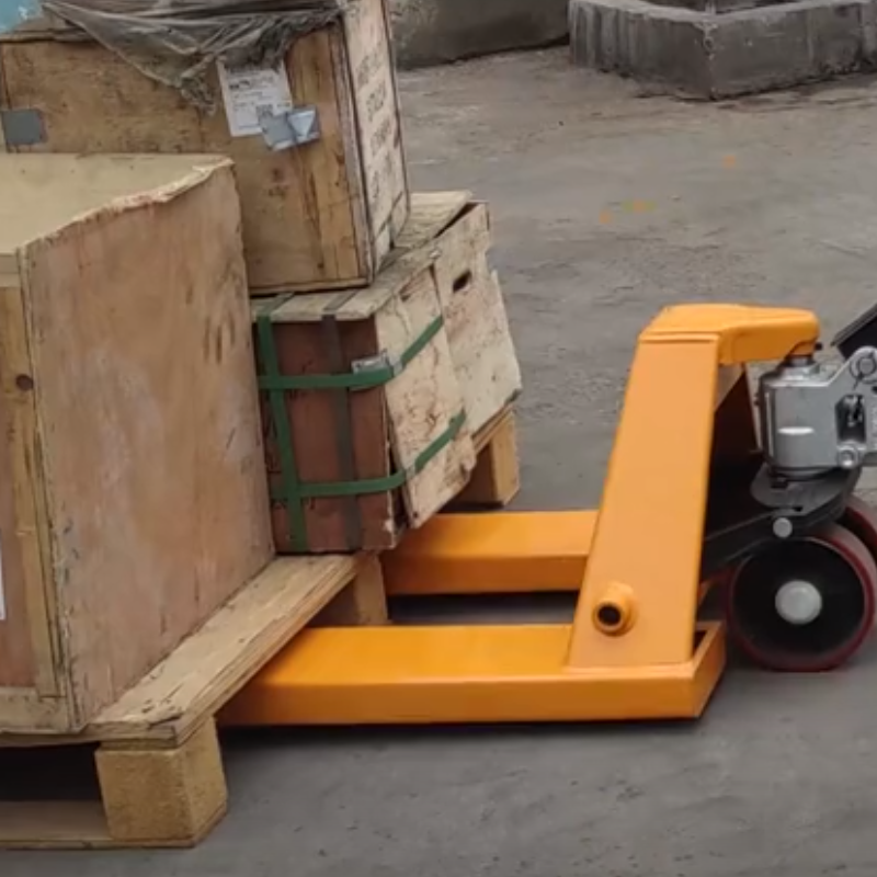 1、先操作泄压阀将货叉放置**高度,控制手柄将地牛的货叉准确叉进托盘下方的空隙内,尽量居中不歪斜,否则容易出现叉起托盘货物歪向一侧的问题,搬运过程中容易物料容易发生翻倒。
